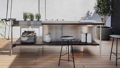 gres porcelánico, fresno termotratado y un exclusivo sistema wrapping anti-UV en las puertas para protección y personalización estética. Ergonomía y modularidad, con soluciones inteligentes que optimizan el espacio y garantizan
