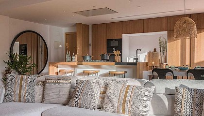 mesitas y luminaria del estudio Raquel Chamorro. El dormitorio cuenta también con una chaise longue diseñada también por el estudio. Se acompaña con dos librerías en blanco roto. En el centro