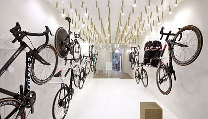 perchas colocadas a lo largo de las paredes. Cuando el estudio P6PA+Architects recibió el encargo de diseñar el interior de una tienda de bicicletas de lujo, los arquitectos quisieron