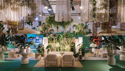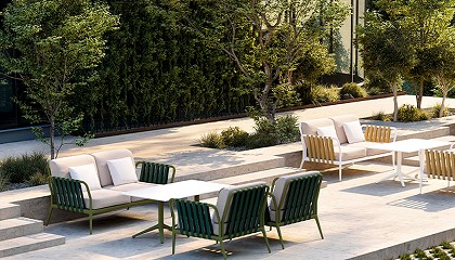 sofás, butacas, lámparas de fibras vegetales y mesas, con sobres de piedra de CupaStone y porcelánico de Sapienstone; todo ello rodeado de exuberante vegetación, para crear un ambiente elegante. Kissing