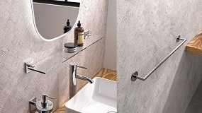 toalleros en barra, en aro y de estante, estantes de vidrio para instalar en la pared, contenedores de ducha en diversas formas y tamaños, escobilleros y papelera. Todos ellos, con una estética