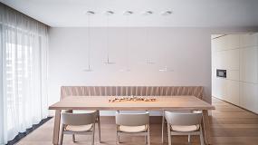 Arola, para iluminar el comedor de este apartamento en Alicante. Las maderas claras que predominan en los muebles dan una sensación de naturalidad, que se refleja en el papel pintado