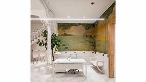 Arola. Foto: Adrià Goula. Para una sala de reuniones circular rodeada por los vitrales originales, el equipo eligió la suspensión Palma, de Antoni Arola, inspirada en los jardines colgantes de la Antigüedad