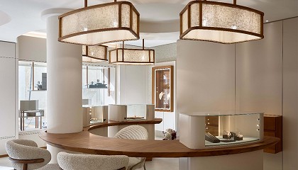 doradas recorren el espacio como líneas de tensión que equilibran movimiento y calma. En el salón, las grandes piezas pulidas amplifican la luz procedente de los ventanales, proporcionando una claridad