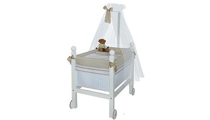 tono, al que se le puede dar un toque más romántico combinándolo con el dosel de tul blanco a conjunto. Vestidura de la minicuna disponible en diferentes colores: azul, rosa, gris y arena.