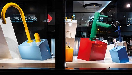 efecto mediterráneo, y están realizados en madera, aunque simulen azulejos; el conjunto es un gran trampantojo”, añade De Bie. Como en el catálogo de NU, el producto es el absoluto protagonista del escaparate. “Cuando decidimos apostar por el color, lo hicimos por colores muy saturados, incluido el blanco, algo que vinculamos a Barcelona y al Mediterráneo" —comentan Inma Bermúdez