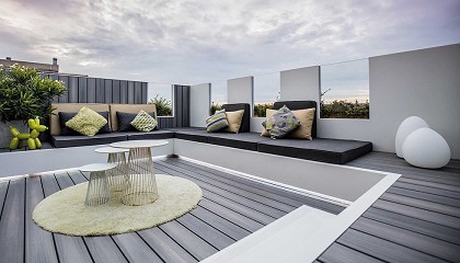 hidromasaje y ducha exterior, una zona de estar con sofás y asientos y un comedor con mesa para 12 comensales. Diferentes ambientes en una sola terraza. Los toldos perimetrales en PVC Cristal