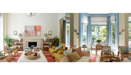 mesitas en un tono frambuesa, con sillones tapizados en amarillo mostaza y otros de fibras naturales, así como un confortable sofá en lino blanco. En las paredes, pintadas en un blanco
