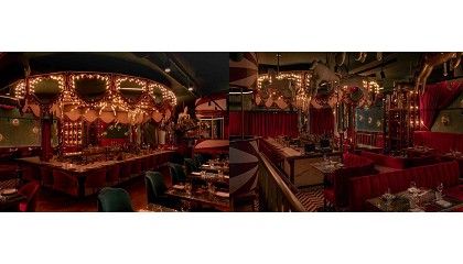 Neolith, con molduras de madera, domina el espacio. Una vez más, remontándose a los orígenes del circo italiano, la comedia y el teatro, el estudio se ha inspirado en las formas