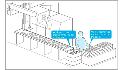 paletizando los artículos a medida que eran retirados de las máquinas por robots de extracción de alta velocidad. Figura 1. El proceso establecido entrañaba el riesgo de dañar las piezas