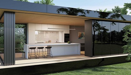 vitrinas Gem en la nueva modularidad de 120 cm, equipadas con nuevos accesorios internos (porta botellas, porta copas, porta platos) soportados por marco en aluminio pintado negro opaco con iluminación