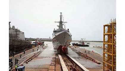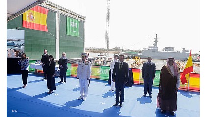 Avante 2200, en representación del vicealmirante Fahad Bin Abdullah Al-Ghofaily, comandante de la Marina Real de Arabia Saudí. La corbeta se ha deslizado por la grada hasta tocar el agua