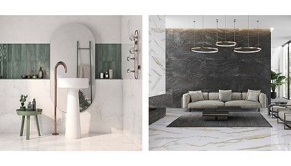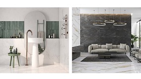 Bosco Grey, Oxford Grey, Statuario White y Aura Black. Las colecciones Mystic (izquierda) e Idyllic (derecha) de Keraben presentan una gran personalidad y elegancia. Por su parte, los mármoles Mystic