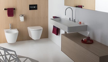 cajoneras a juego, armarios altos con o sin puertas de espejo, y un práctico carrito completan la colección de mobiliario de baño. Space está disponible en acabados en olmo oscuro