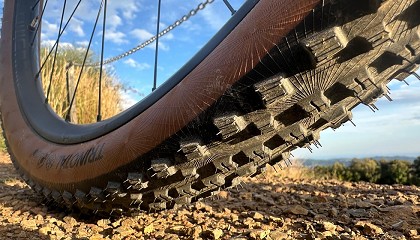 Fotografía de los Trinotal de Continental en 2,4" en plena carrera (Open Maxxis Santa Eulàlia de Ronçana 2025), en situación de mucho barro y raíces mojadas. Es un neumático