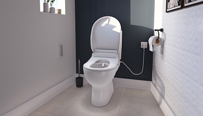 inodoro multifuncional con función bidé Saniseat+ de Sanitrit. Equipado con una ducha de mano de chorro de aire con temperatura regulable, Saniseat es compatible con la mayoría de los inodoros
