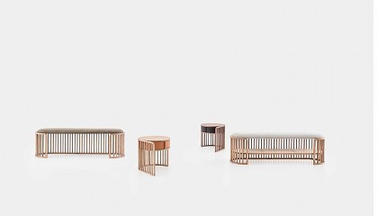 mesita de noche y un asiento de banco, diseñada por Raffaella Mangiarotti, revela una referencia visual a las cañas; la cama Embrace, del estudio sueco Note Design Studio, ofrece un espacio