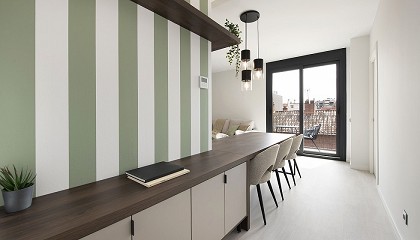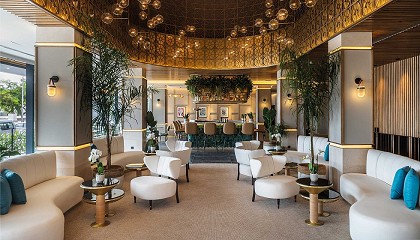 mesitas bajas, en mármol y estructura de metal dorado, y con sillería y pufs en fibra natural trenzada. Las piezas de mobiliario y decoración escogidas reflejan la apuesta por la calidez