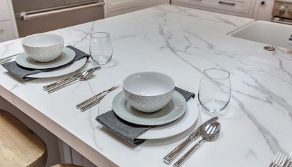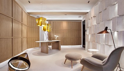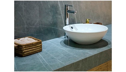 Neolith, con su piedra Himalaya Crystal en acabado pulido, estuvo en el Espacio ‘Cleo’ de Jacob Delafon diseñado por Devesa & Agenjo Interiorismo. Orac Decor, con sus referencias flexibles y molduras