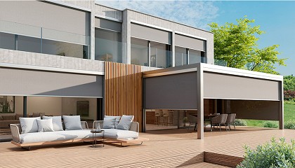 Tela estética. Para grandes ventanales y pérgolas. Clase de resistencia al viento hasta CRV 6. Cambio sencillo de la tela gracias a la tecnología de burlete de clip. Opción de enchufe