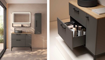 tirador en cromo o en negro, lo que permite personalizarlo según el estilo y las preferencias del usuario. Vima. Con un mueble de fondo 45 cm, la serie Vima ofrece