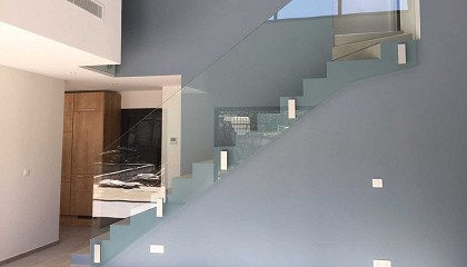 barandilla: barandilla con perfil en largo, barandilla con pinzas y también para diferentes vidrios (5+5, 6+6, 8+8 y 10+10). Se trata de barandillas con un diseño
