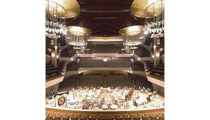 Colmenar se alza el volumen blanco e irregular de las salas de conciertos, visible tras el frontón partido del alzado principal. La Sala Sinfónica se dispone en el extremo norte
