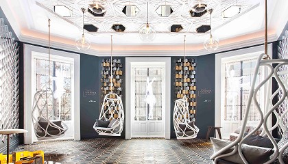 columpios que imitan su estética para insinuar el vaivén de la danza; cristaleras que se convierten en espejos con formas geométricas para crear juegos de luz calidoscópicos; o suelos modernistas