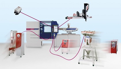 deshumidificadores de material y mezcladores gravimétricos o volumétricos. La inyectora y los citados dispositivos conectados a ella, incluido en ocasiones un robot con automatización posterior e inspección de calidad, se combinan