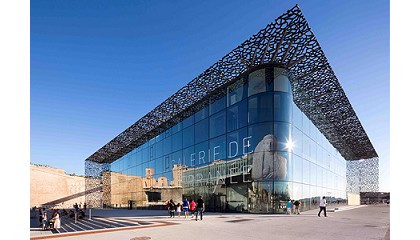 dosel de hormigón situado encima de ella mediante un inteligente sistema de cables de acero inoxidable. El amplio velo que rodea la terraza está formado por la misma filigrana de hormigón