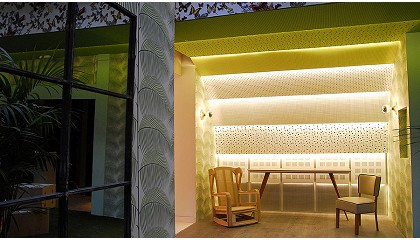 fonoabsorbentes Pladur Fon+ tanto continuos como registrables en diferentes perforaciones y acabados decorativos. El decorador encargado del diseño de la pared creativa de Pladur, Guillermo García Hoz, ha señalado que “las placas