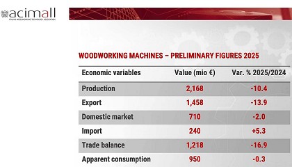 maquinaria italiana para la madera se contrae un 10,4% en 2025 - 30/01/2026: Descenso de producción y exportaciones tras tres años de máximos históricos La producción de maquinaria italiana para