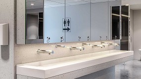 pulsadores Geberit Sigma21 y Sigma70 para la descarga del inodoro, los lavabos Geberit VariForm sobre encimera, así como los grifos electrónicos Geberit Piave en acabado negro mate antihuellas, productos a la última