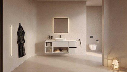 tonos naturales –blanco mate, gris arena, terracota y ónix– con tres variantes de madera –pino blanco, olmo claro y magnolia–. Las encimeras se ofrecen en madera o en efecto piedra