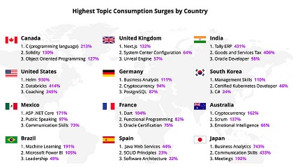 Cisco (538%) Informática PowerCenter (513%) HR Analytics (472%) Pentaho (441%) Eclipse IDE (396%) Salesforce Sales Cloud Consultant (375%) Tally ERP (355%) Oracle Developer (268%) Check Point Security (239%). Por su parte