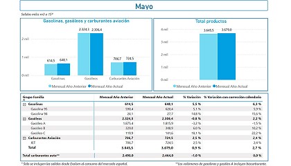 carburantes de automoción alcanzaron los 2,5 millones de metros cúbicos, al mismo nivel que en mayo de 2024. En cuanto al total de gasóleos (A+B+C), las salidas