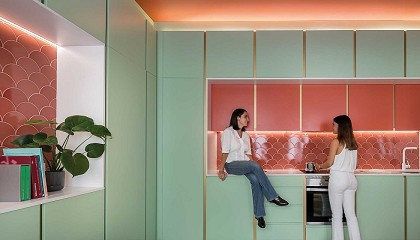 coral. Estas piezas se enmarcan en dos armariadas color menta que envuelven la nueva vivienda. Los paños de escamas cerámicas se han colocado intencionadamente frente a las ventanas para que la luz natural