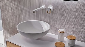 encimera y lavabo encastrado, fabricados de una sola pieza o con lavabo sobre encimera. Ambos realizados en materiales de suaves texturas y diseños curvos delicados. Lavabo de sobre encimera de la serie