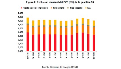 gasóleo A aumentó un 2,7 por ciento en este periodo, llegando a los 27,9 céntimos por litro. Asimismo, durante octubre de 2023, la demanda nacional de gasolina 95 y gasóleo