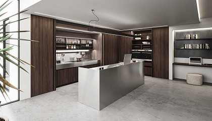 librería modular “Vertical”, además de estar disponible en versión mural, se convierte en un práctico elemento que separa armoniosamente la cocina y las zonas de estar. Ergonomía, accesorios prácticos y materiales