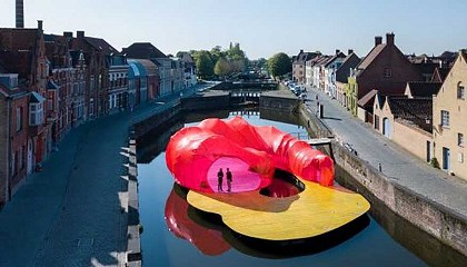 nadadores. Imagen: Iwan Baan. La estructura con paredes de vinilo transparente de color rosa, naranja y amarillo le da color al agua y forma un lugar ideal para descansar. Aunque