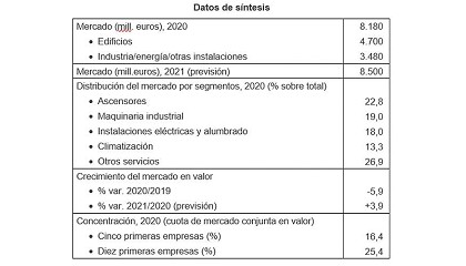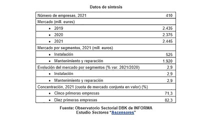 DBK de Informa, tras varios años de crecimiento, el mercado total de instalación, mantenimiento y reparación de aparatos elevadores mantuvo un buen comportamiento en 2021, creciendo cerca de un 3%. Esta