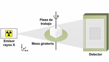 bidimensional (2D). Gracias al giro de la mesa, se toman diferentes imágenes de la pieza en estudio, cuyas proyecciones son analizadas para generar un modelo tridimensional (3D) de la misma