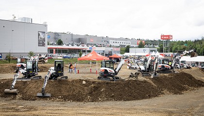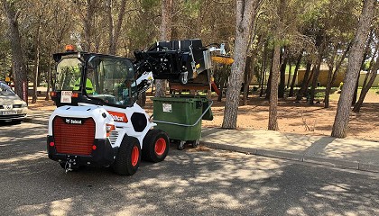 césped del campo del fútbol. Esto lo pueden realizar con la cargadora articulada Bobcat L28 gracias al bajo nivel de alteración del suelo y a que el modo de césped
