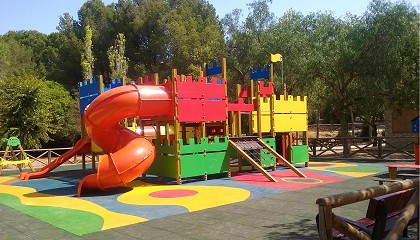 columpio con asiento de bebé, mesas infantiles y varios bancos para descansar. El recinto cuenta con una valla perimetral de madera que dota a la zona de mayor seguridad. Todos