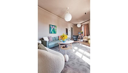 Copenhague en 1940, y dialoga perfectamente con la contemporánea lámpara Yuh, diseñada en 2017, por el joven dúo GamFratesi para Louis Poulsen. La acompaña una mesa de trabajo modelo Graceful