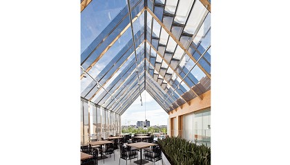 Dekton’, con tratamiento gráfico superficial. Detalle 2: CU11 Policarbonato compacto, e: 10 mm; CU12 Policarbonato celular, e: 32 mm; CU61Perfil de acero galvanizado; CU27 Canalón pluvial de acero galvanizado pintado