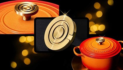 dorados y el pomo especial de crisol (o el llamado ‘creuset’, en francés, que da nombre a la marca). Fabricado en acero inoxidable con un suave acabado dorado, este pomo