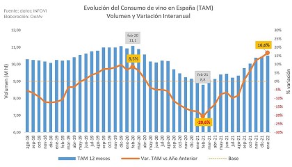 Ene 21): en el TAM Dic-Ene 22 crecen tanto en volumen como en valor, los vinos con Denominación de Origen Protegida (DOP) los vinos con Indicación Geográfica Protegida (IGP) y los Espumosos