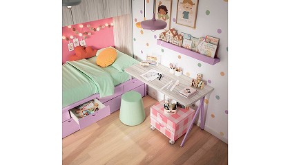 estanterías de líneas curvas, rompiendo con la rigidez del mobiliario tradicional. La combinación de frentes en color Peach con madera oscura crea un espacio fluido, visualmente acogedor y alineado con las propuestas